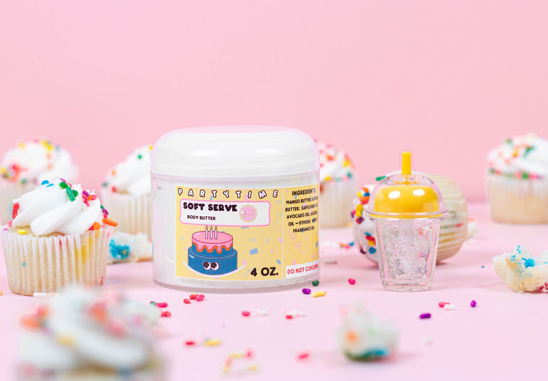 One: Scrubbie Shake Lip Gloss, Soft Serve Body Butter & HandScooped Whipped Soap.